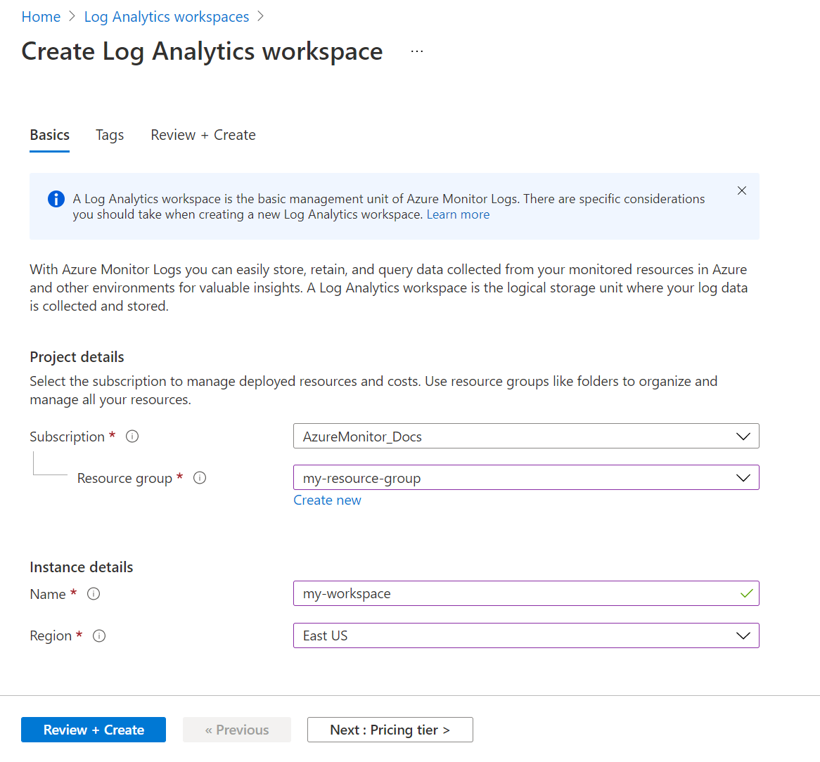 On the Basics tab, select a subscription, resource group, and region for the workspace. These values don't need to be the same as the resource being monitored. Provide a name that must be globally unique across all Azure Monitor subscriptions.