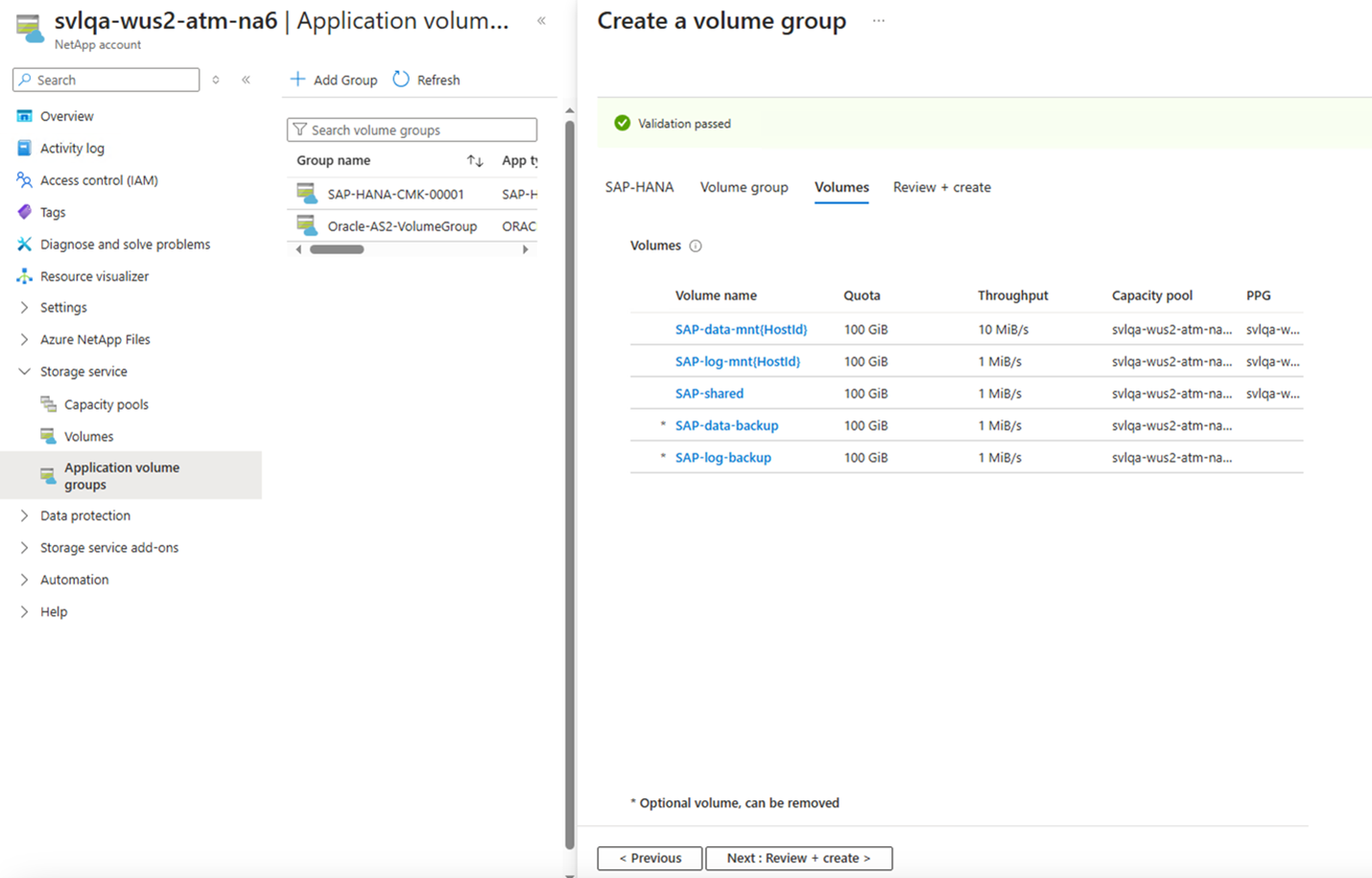 All volumes are placed in a single manual QoS capacity pool. If you want to create the log-backup and data-backup volumes in a separate capacity pool, you can choose not to add those volumes to the volume group.Virtual network: