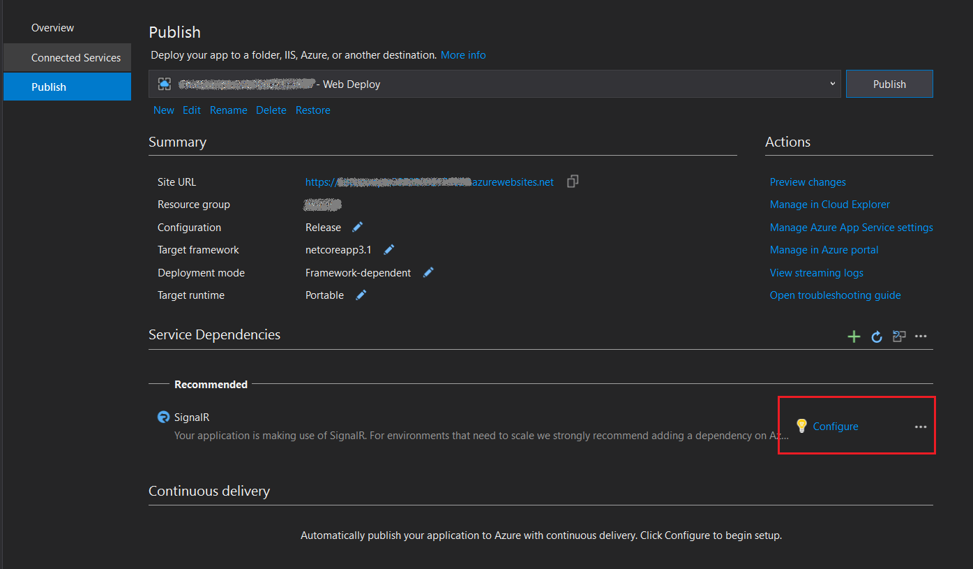 After the creation of the publish profile, you can see a recommendation message to add Azure SignalR service under Service Dependencies. Select Configure to create a new or select an existing Azure SignalR Service in the pane.