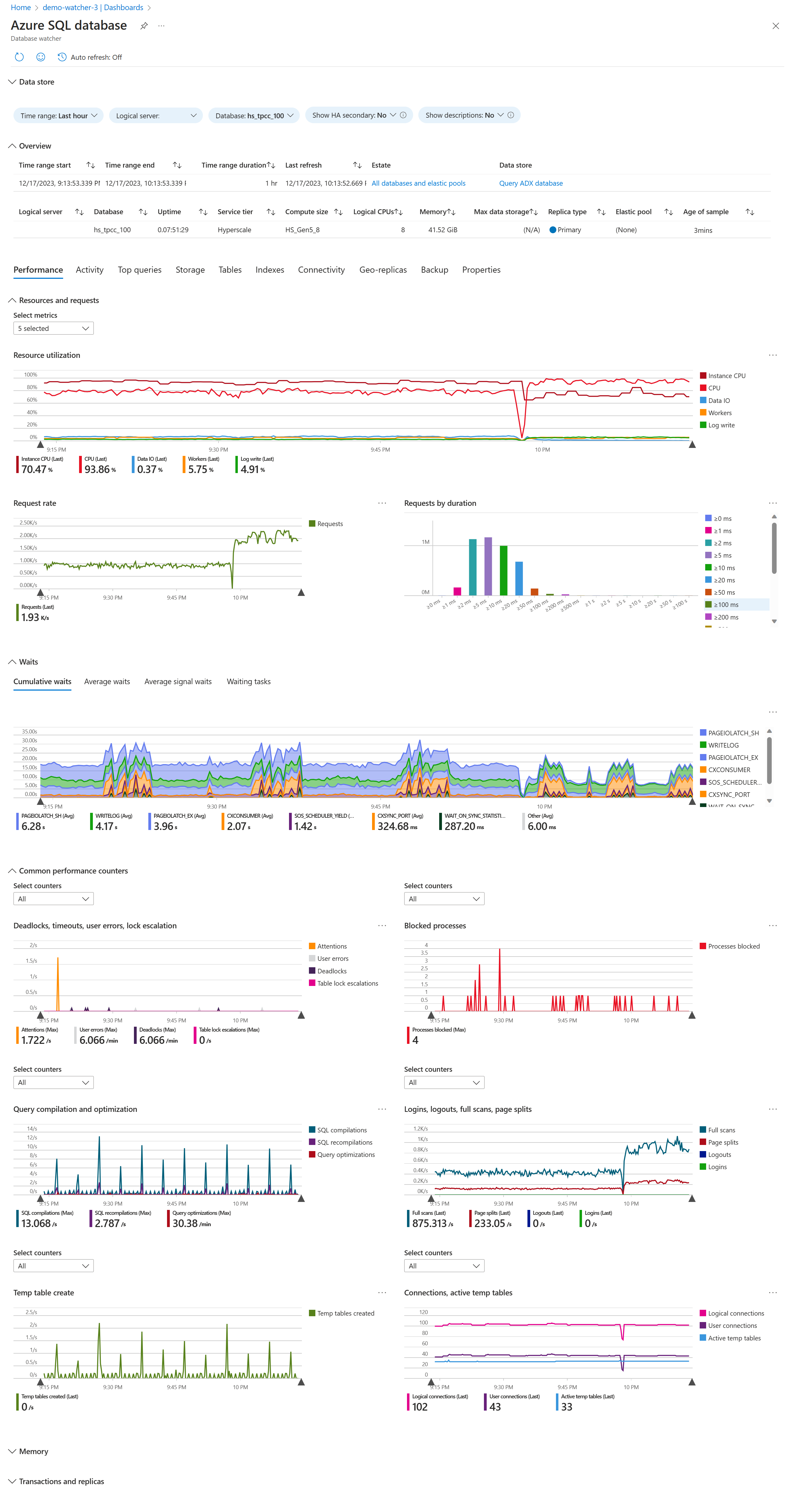 Resource dashboards Visualize detailed monitoring data for a database, an elastic pool, or a SQL managed instance, including: