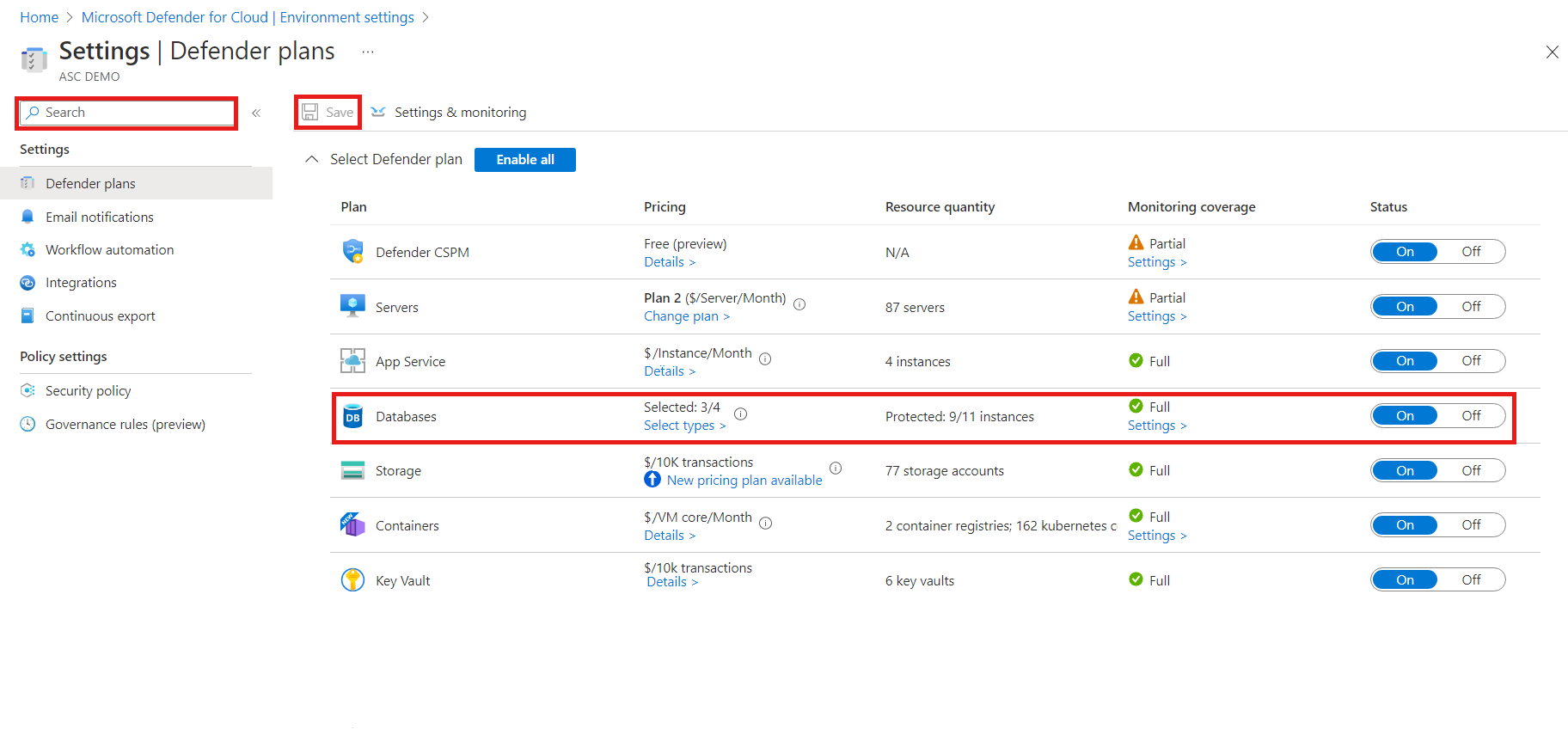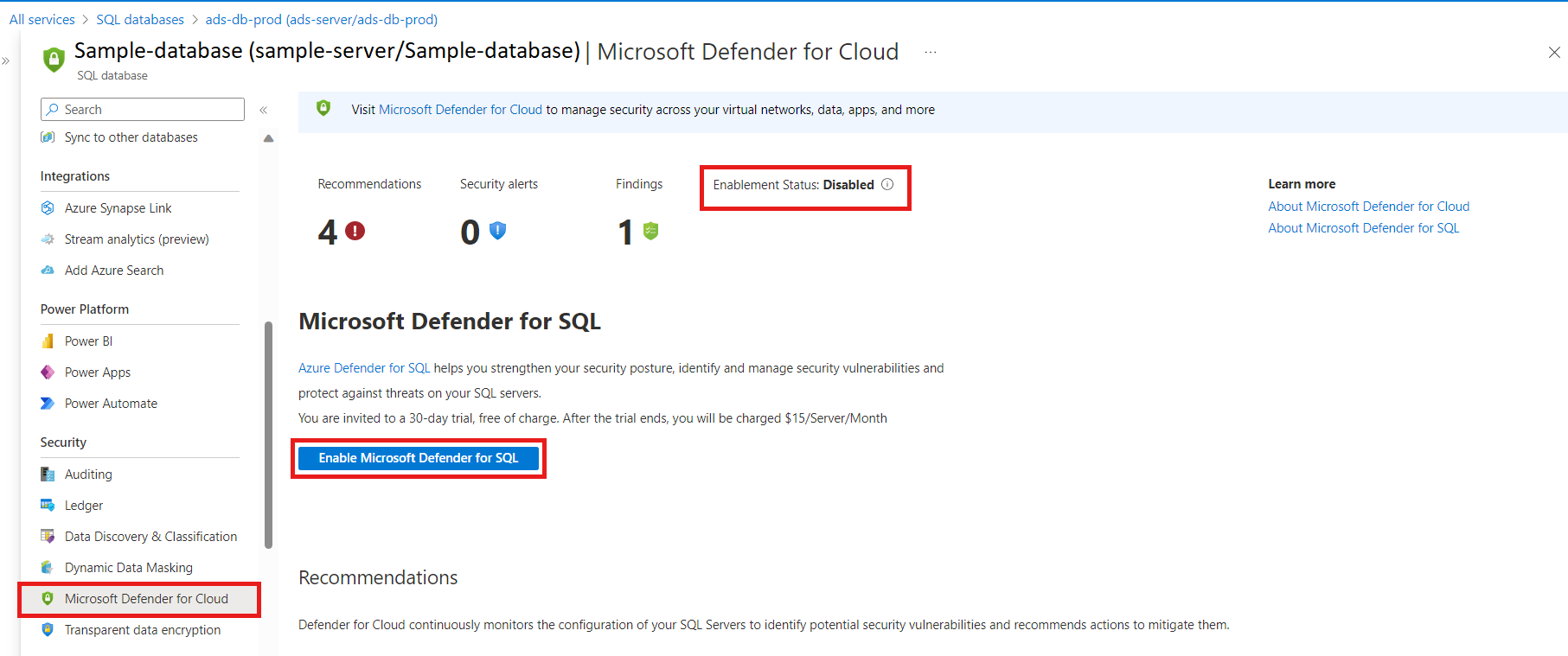On this page, you see the status of Microsoft Defender for SQL (disabled or enabled):
