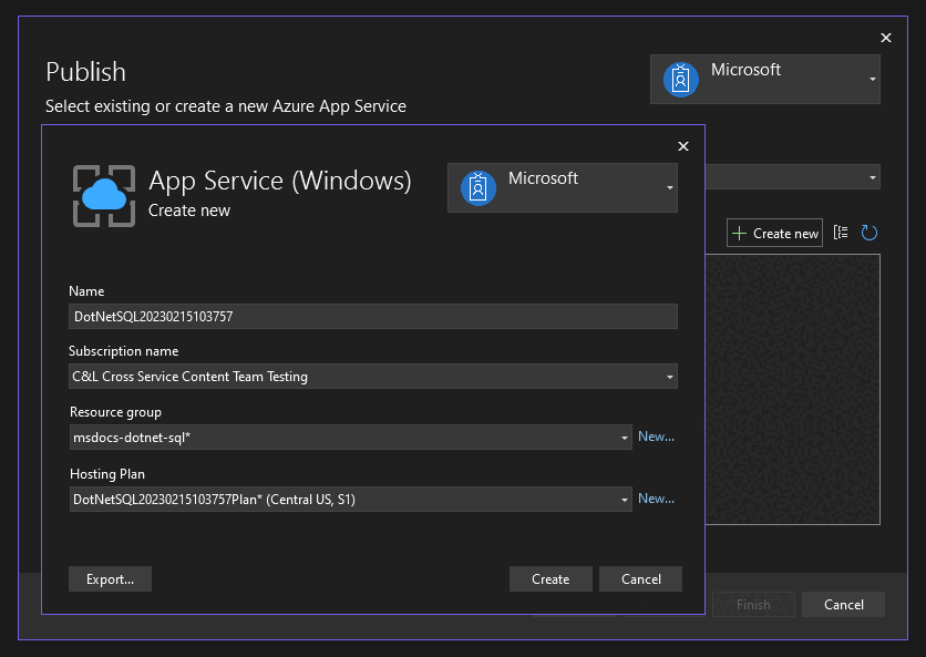 - Select Create to close the original dialog. Visual Studio creates the App Service resource in Azure.