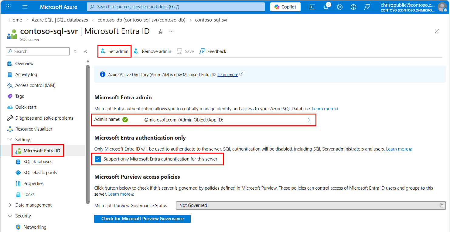 The server must also have Microsoft Entra authentication enabled and have a Microsoft Entra admin account assigned. For local development connections, the Microsoft Entra admin account should be an account you can also log into Visual Studio or the Azure CLI with locally. You can verify whether your server has Microsoft Entra authentication enabled on the Microsoft Entra ID page of your logical server.