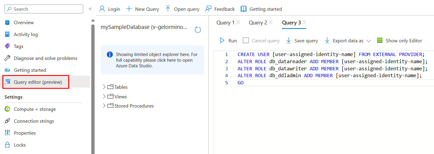CREATE USER [user-assigned-identity-name] FROM EXTERNAL PROVIDER; ALTER ROLE db_datareader ADD MEMBER [user-assigned-identity-name]; ALTER ROLE db_datawriter ADD MEMBER [user-assigned-identity-name]; ALTER ROLE db_ddladmin ADD MEMBER [user-assigned-identity-name]; GORunning these commands assigns the SQL DB Contributor role to the user-assigned managed identity. This role allows the identity to read, write, and modify the data and schema of your database.