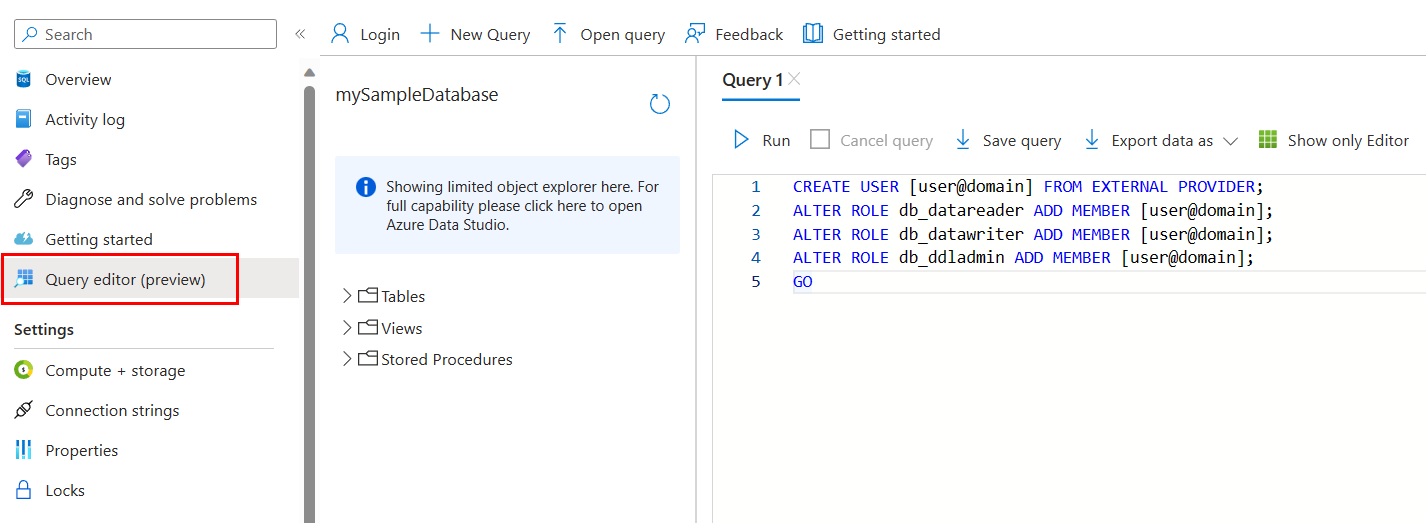 CREATE USER [user@domain] FROM EXTERNAL PROVIDER; ALTER ROLE db_datareader ADD MEMBER [user@domain]; ALTER ROLE db_datawriter ADD MEMBER [user@domain]; ALTER ROLE db_ddladmin ADD MEMBER [user@domain]; GORunning these commands assigns the SQL DB Contributor role to the account specified. This role allows the identity to read, write, and modify the data and schema of your database. For more information about the roles assigned, see Fixed-database roles.