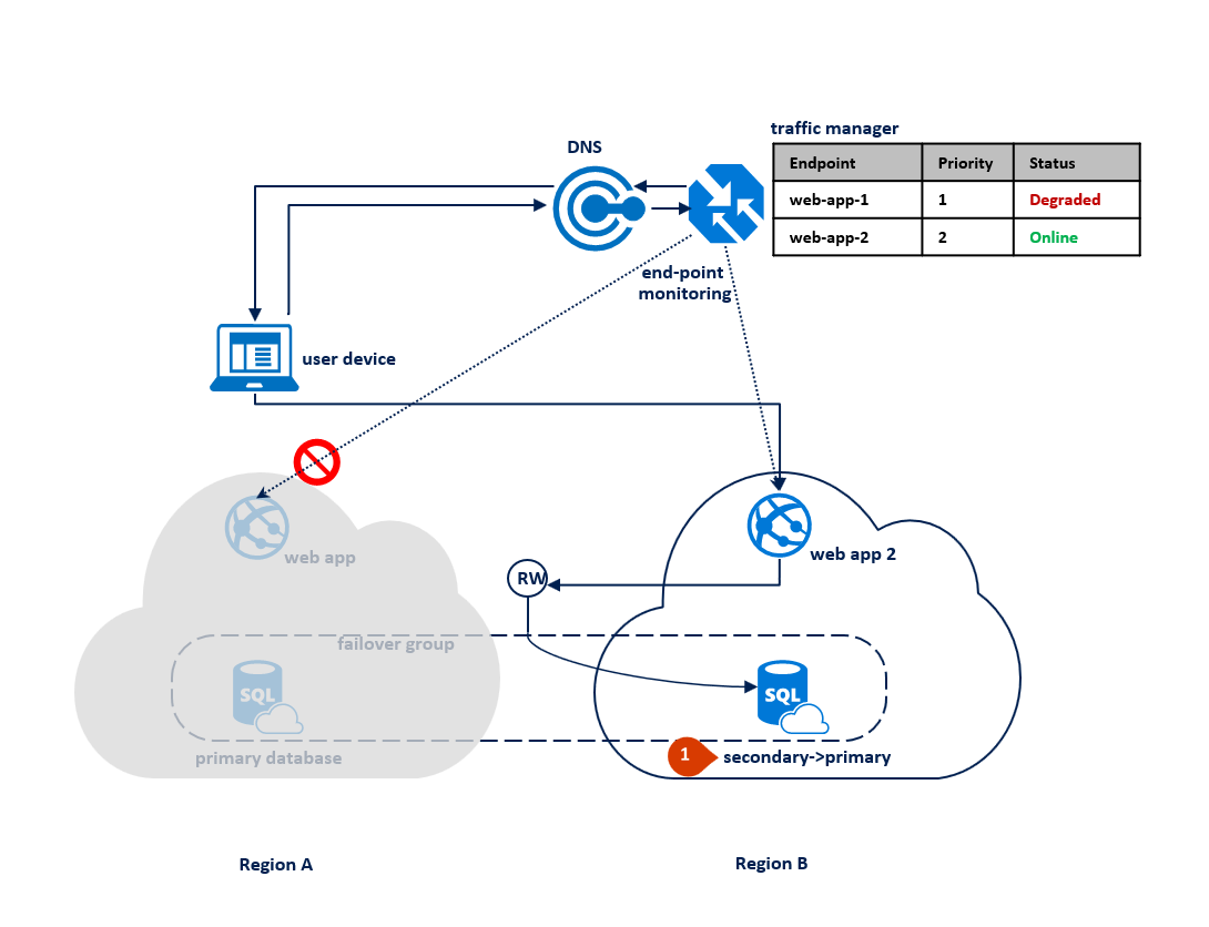 When Traffic Manager detects a connectivity failure to region A, it automatically switches user traffic to the application instance in region B. With this pattern, it is important that you set the grace period with data loss to a sufficiently high value, for example 24 hours. It ensures that data loss is prevented if the outage is mitigated within that time. When the web application in region B is activated the read-write operations start failing. At that point, it should switch to the read-only mode (1). In this mode the requests are automatically routed to the secondary database. If the outage is caused by a catastrophic failure, most likely it cannot be mitigated within the grace period. When it expires the failover group triggers the failover. After that the read-write listener becomes available and the connections to it stop failing (2). The following diagram illustrates the two stages of the recovery process.