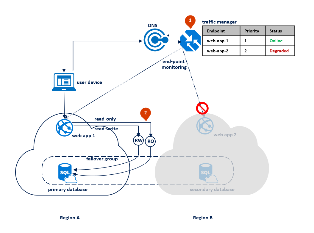 If an outage happens in region B, Traffic Manager detects the failure of the endpoint web-app-2 in region B and marks it degraded (1). In the meantime, the failover group switches the read-only listener to region A (2). This outage does not affect the end-user experience but the primary database is exposed during the outage. The following diagram illustrates a failure in the secondary region:
