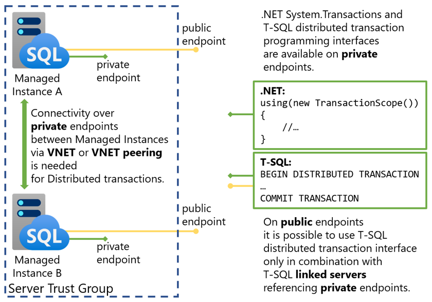 - Managed Instances that participate in distributed transactions need to have connectivity over private endpoints (using private IP address from the virtual network where they are deployed) and need to be mutually referenced using private fully qualified domain names (FQDNs). Client applications can use distributed transactions on private endpoints. Additionally, in cases when Transact-SQL leverages linked servers referencing private endpoints, client applications can use distributed transactions on public endpoints as well. This limitation is explained on the following diagram.