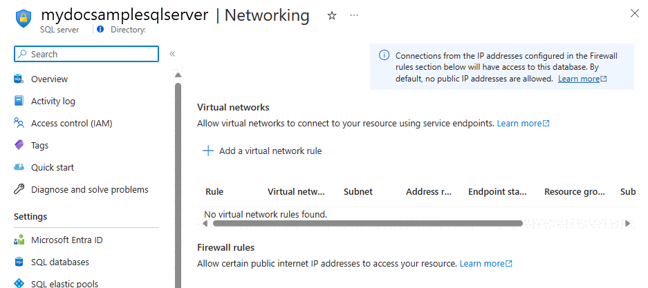When you create a new server in Azure SQL Database or Azure Synapse Analytics named mysqlserver, for example, a server-level firewall blocks all access to the public endpoint for the server (which is accessible at mysqlserver.database.windows.net). For simplicity, SQL Database is used to refer to both SQL Database and Azure Synapse Analytics. This article does not apply to Azure SQL Managed Instance. For information about network configuration, see Connect your application to Azure SQL Managed Instance.