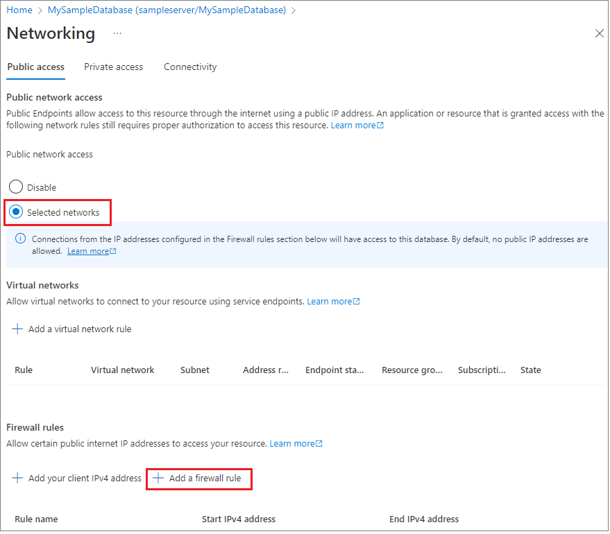 Choose Add your client IP to add your current IP address to a new, server-level, firewall rule. This rule can open Port 1433 for a single IP address or for a range of IP addresses. You can also configure firewall settings by choosing Add a firewall rule.