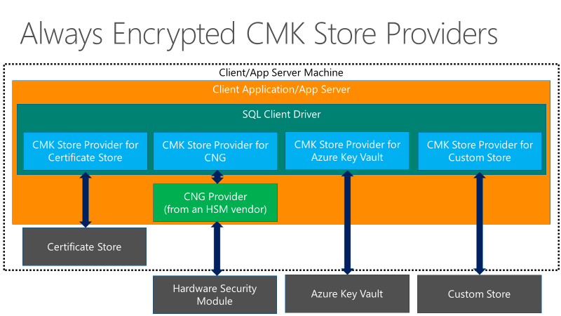 The following diagram shows the key store options for the column master keys in Always Encrypted: