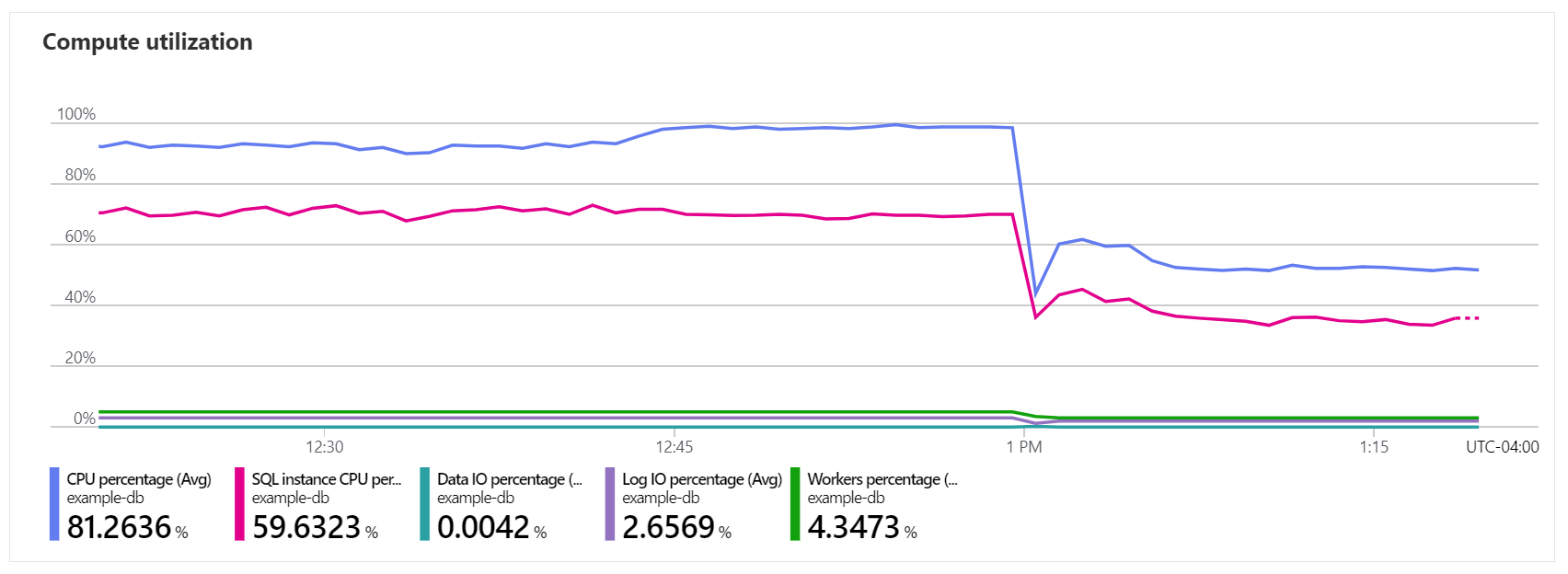 This metric shows DTU consumption toward the user workload limit of a database or an elastic pool, expressed as a percentage. DTU percentage is derived from three other metrics: CPU percentage, Data IO percentage, and Log IO percentage. At any point in time, DTU percentage matches the highest value among these three metrics. |