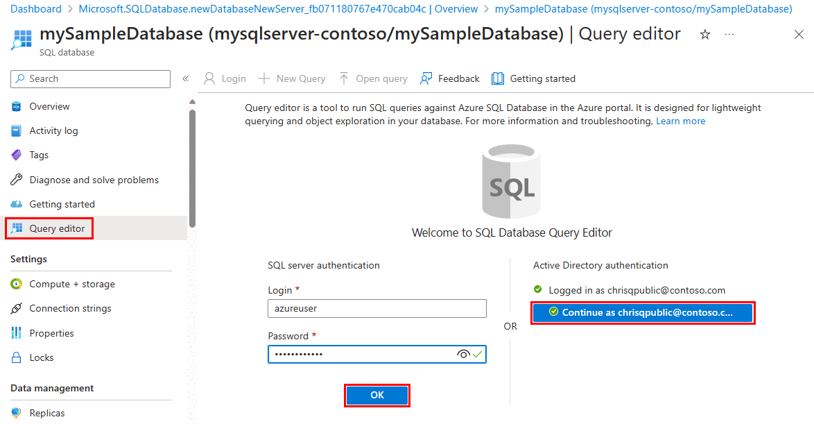 Once your database is created, you can use the Query editor (preview) in the Azure portal to connect to the database and query data. For more information, see Azure portal query editor for Azure SQL Database.