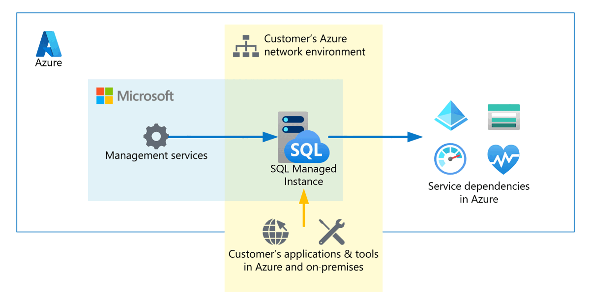 The following diagram shows entities that connect to SQL Managed Instance. It also shows the resources that need to communicate with a SQL managed instance. The communication process at the bottom of the diagram represents customer applications and tools that connect to SQL Managed Instance as data sources.
