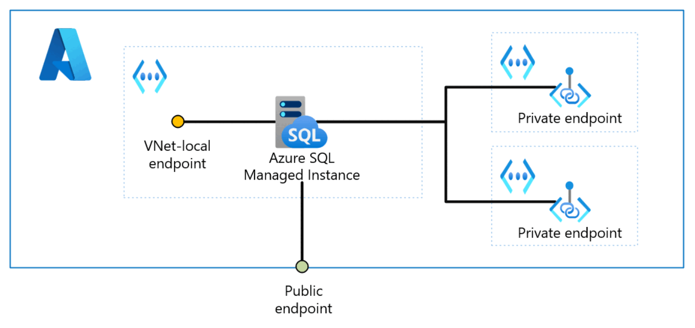 Diagram that shows the scope of visibility for VNet-local, public, and private endpoints to an Azure SQL Managed Instance.