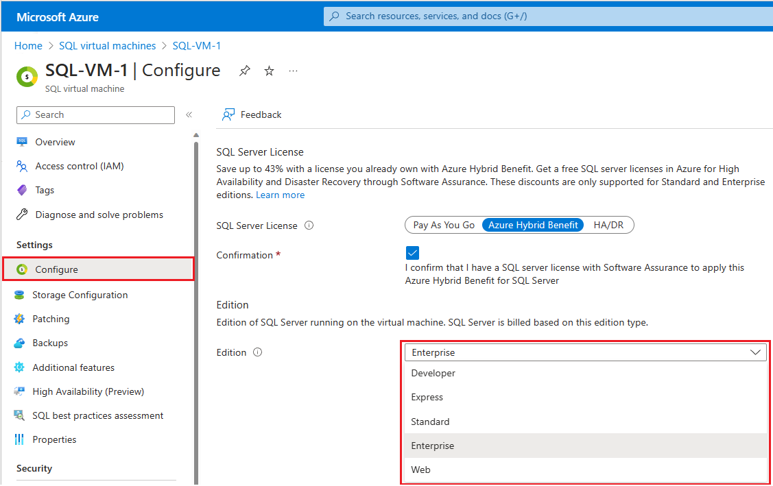 - After SQL Server is updated on the VM, make sure that the Edition property of SQL Server in the Azure portal matches the installed edition number for billing.