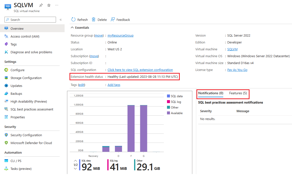 You can also see the status of the SQL Iaas Agent extension under Extension health status. If your status is Unhealthy or Failed, you can find out more information from the Notifications tab.