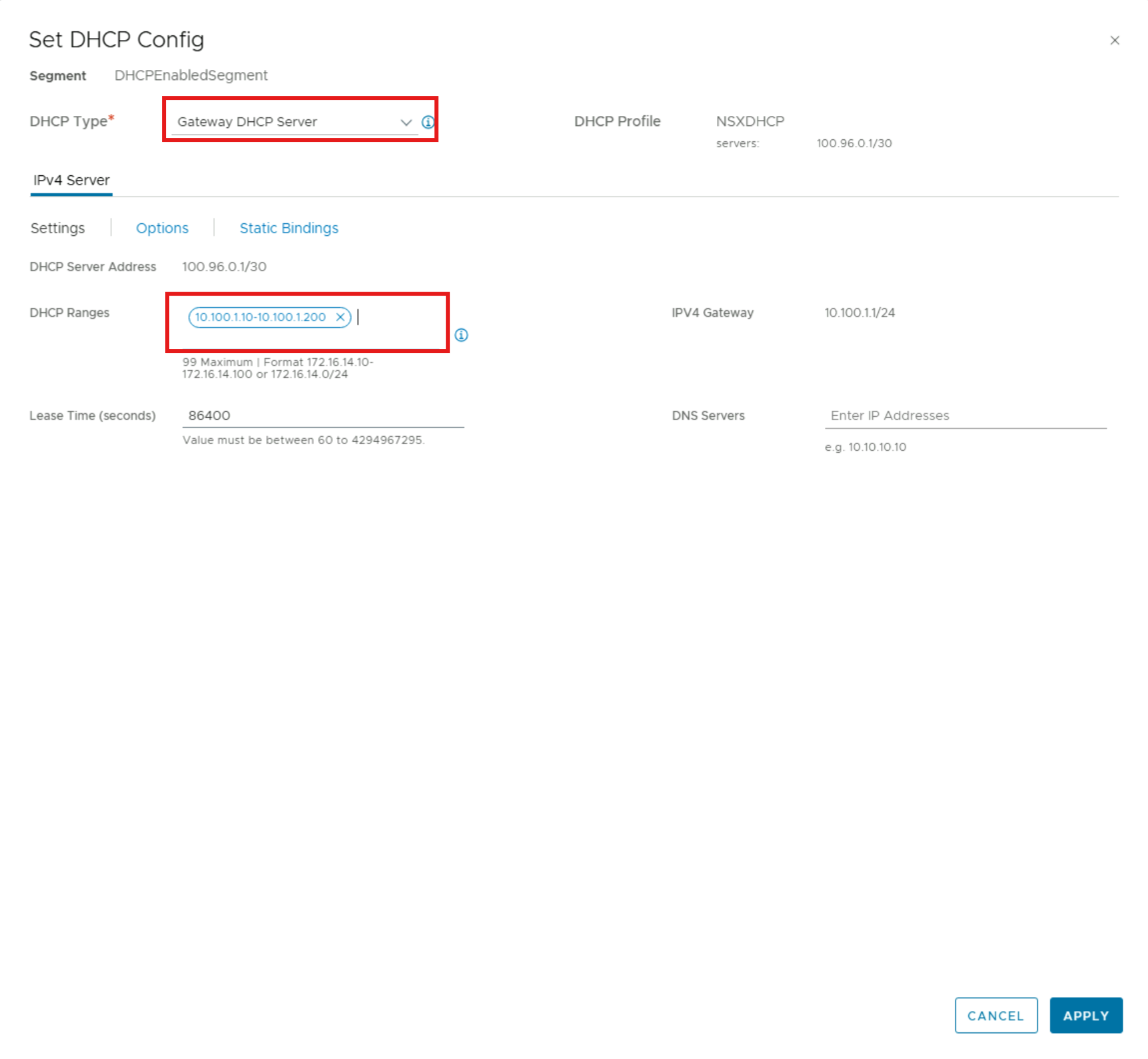 Select Gateway DHCP Server for DHCP Type, add a DHCP range, and select Apply.