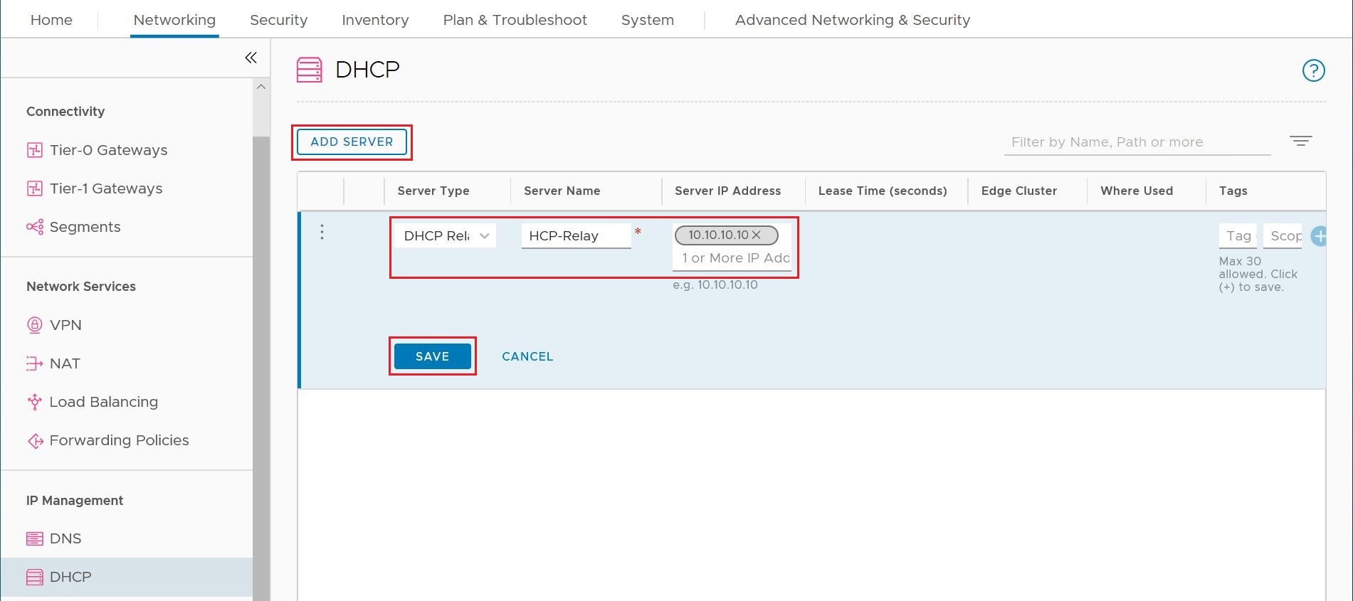 In NSX Manager, select Networking > DHCP, and then select Add Server.