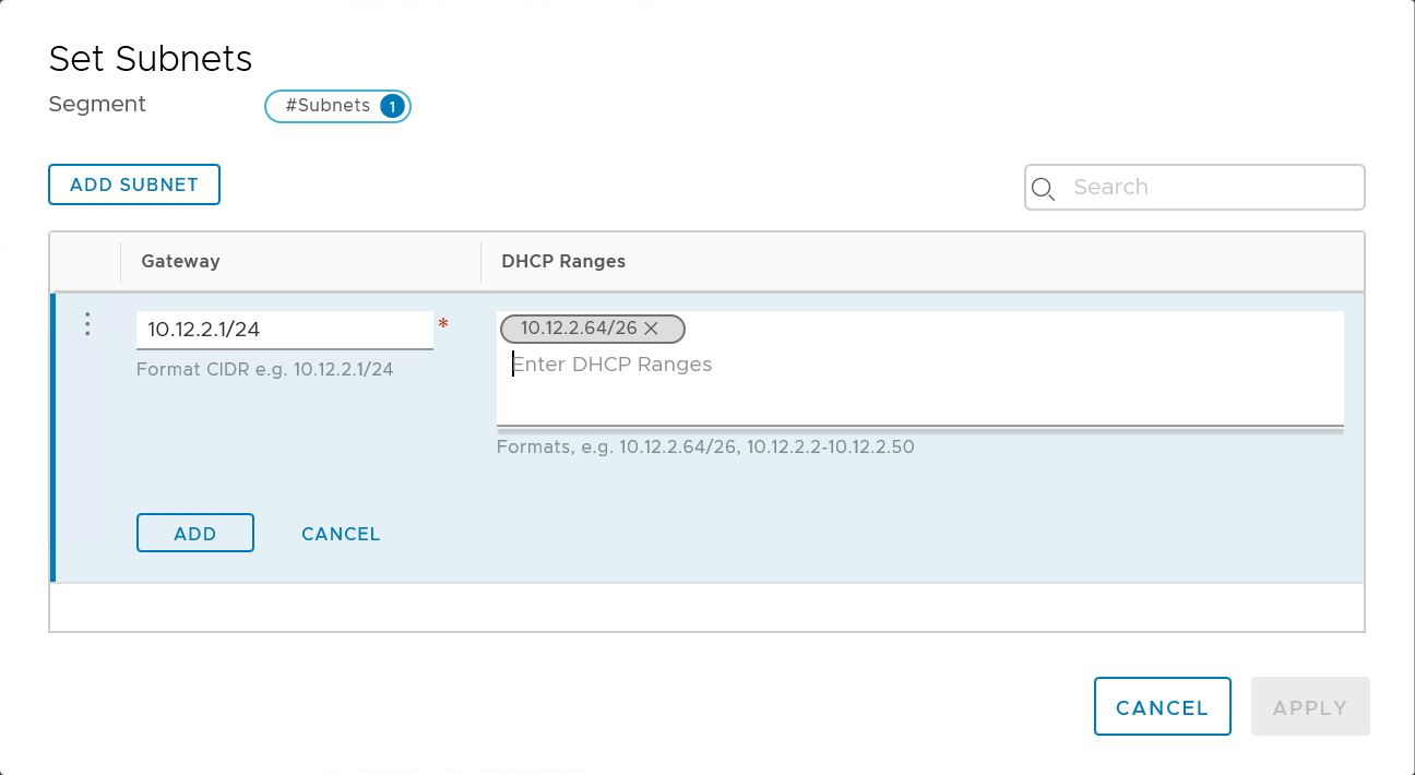 Navigate to Networking > Segments and find the segment where DHCP is required. Select on Edit then Set DHCP Config.
