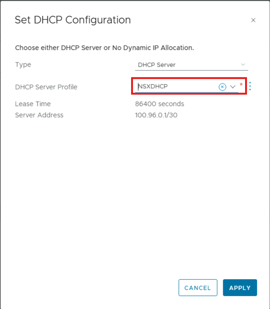 Select Set DHCP Configuration, select DHCP Server and then select the DHCP Server Profile created earlier. Select Save, then Close Editing.
