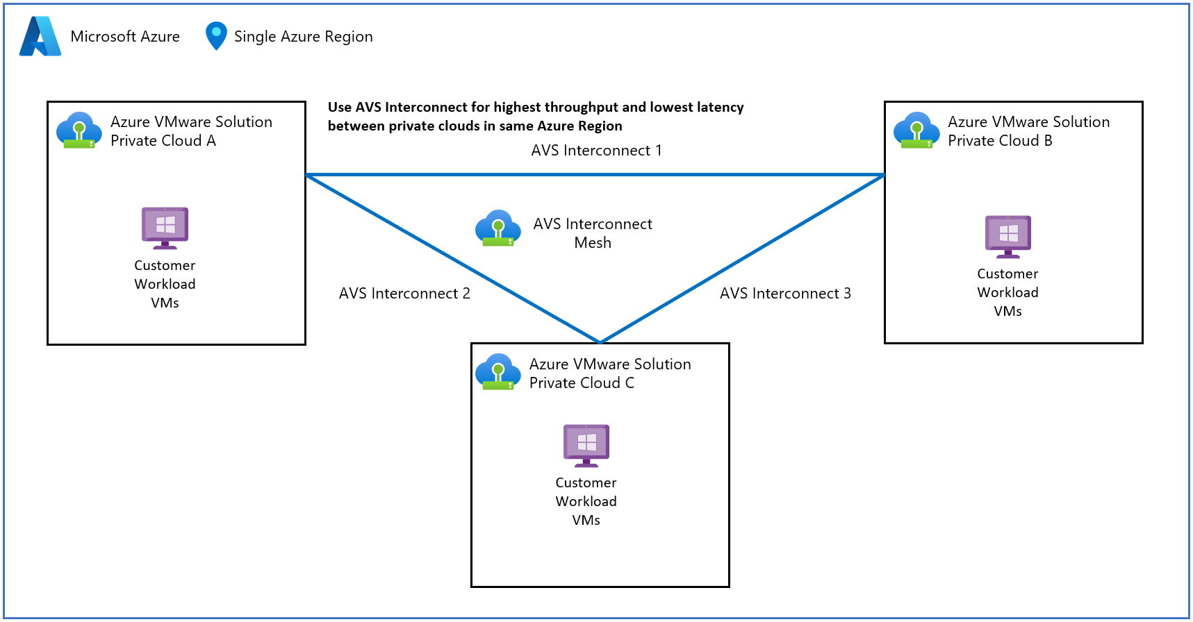 The AVS Interconnect feature lets you create a network connection between two or more Azure VMware Solution private clouds located in the same region. It creates a routing link between the management and workload networks of the private clouds to enable network communication between the clouds.