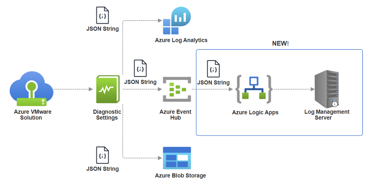 Azure Logic Apps enables you to automate workflows by integrating various Azure services and third-party applications. You can use Logic Apps to collect and forward VMware syslogs from your Azure VMware Solution private cloud to any log management service of your choice. This approach allows for centralized log storage, analysis, and monitoring across your preferred tools.