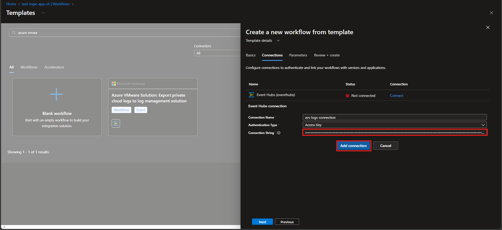 - Next, connect the Event Hub that houses the Azure VMware Solution logs to this Logic App instance. To do so, click Connect. Provide a name for Connection Name, Authentication Type will remain Access Key. For Connection String, you need to retrieve the Connection String from the Event Hub instance you intend to use.