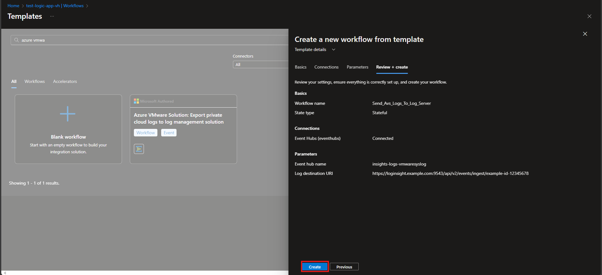 - Review the information provided, then click Create. This action saves the workflow that can be used to send the log messages from Azure VMware Solution to any syslog endpoint.