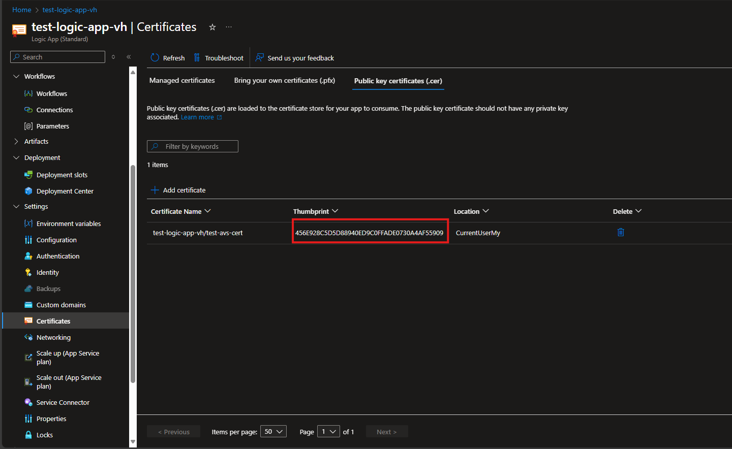 In the Azure Logic App, navigate to Settings > Certificates. Navigate to the tab that says Public key certificates (.cer) and click on Add certificate.