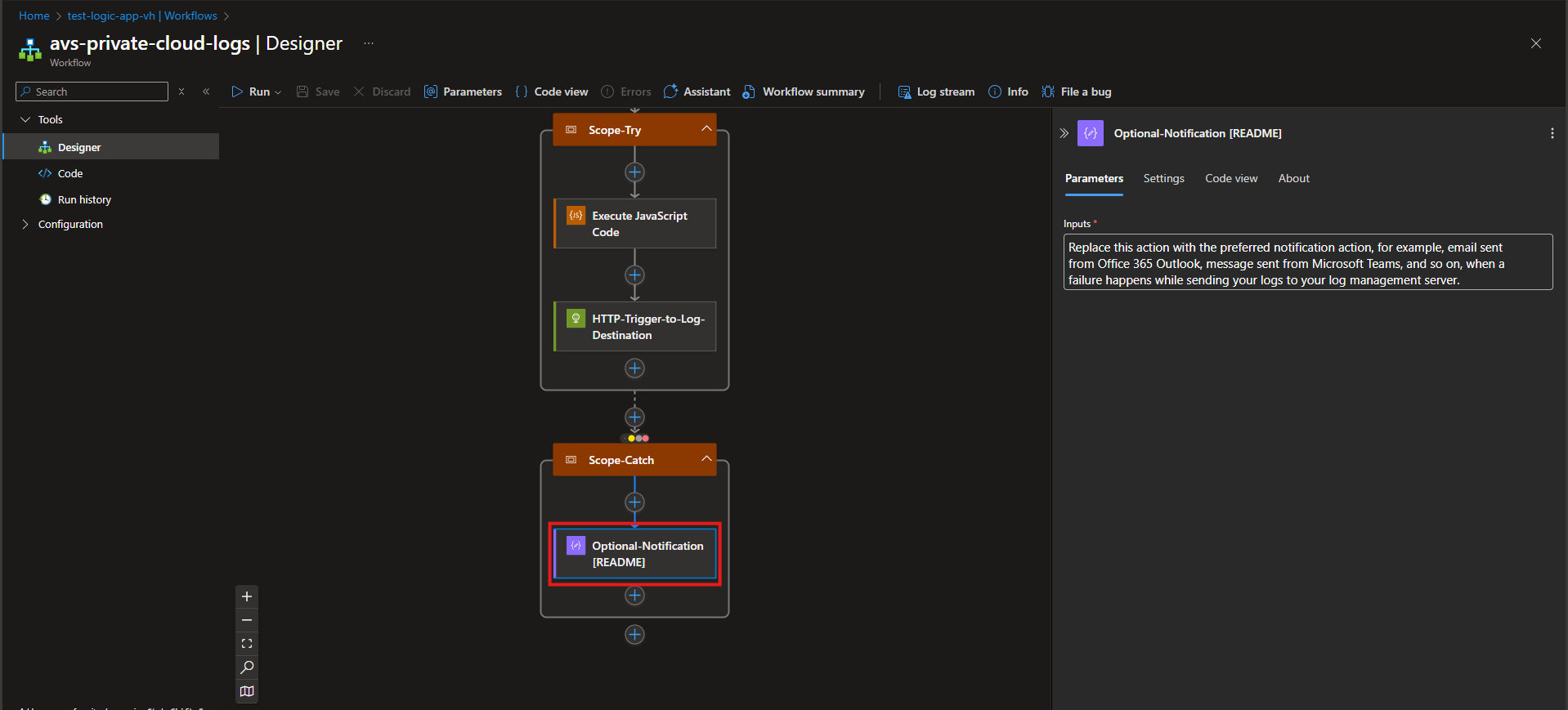 You will notice in the last step of the workflow that there is an optional item called Optional-Notification (README). You may replace this item with one of the available actions in Azure Logic Apps, such as Outlook emails or Teams messages, to notify you in the event there is a failure sending your logs to your log management server.