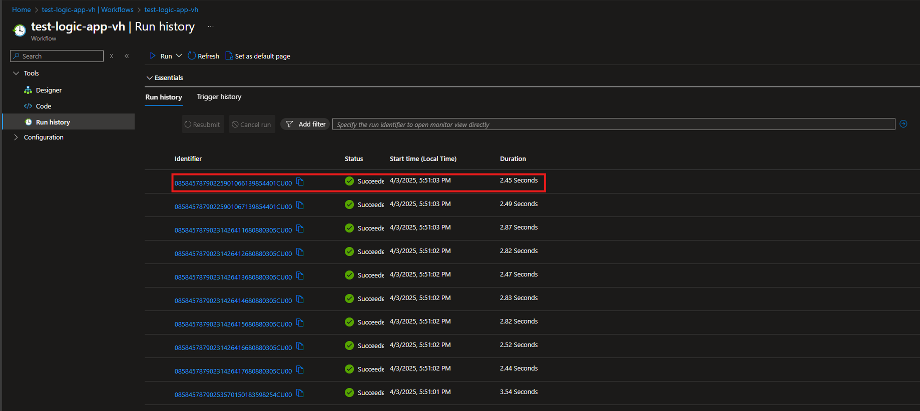 The Run History section of a workflow in Azure Logic Apps provides a detailed log of workflow executions, helping you track successful runs, diagnose failures, and troubleshoot issues. By reviewing the timestamps, status codes, and error messages, you can ensure your Azure VMware Solution syslog forwarding process is running smoothly and quickly identify any disruptions.