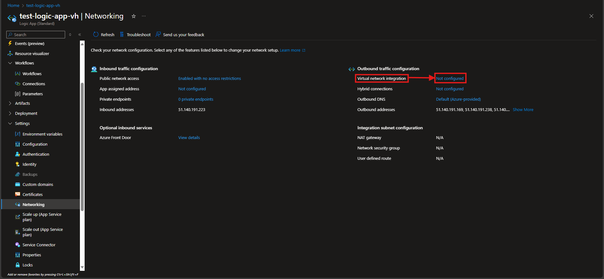 Select the highlighted text that says Not configured next to Virtual Network integration.
