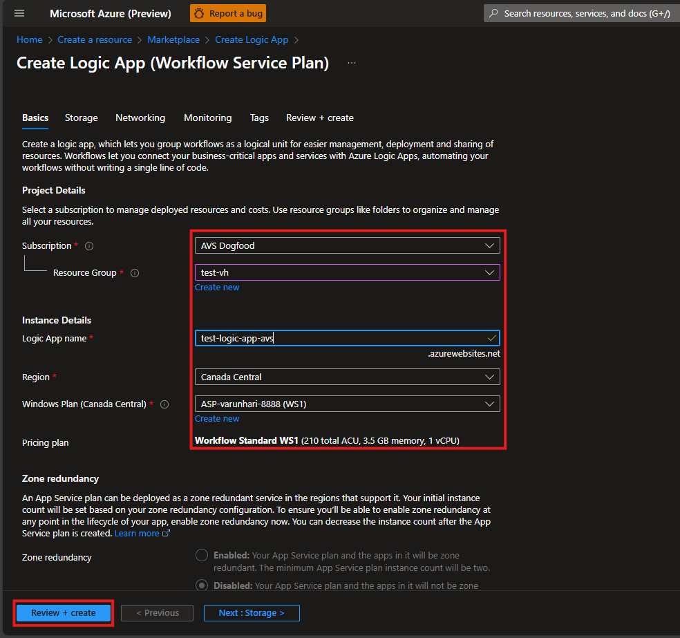 - Enter the Subscription you intend to use, the Resource Group chosen to house this instance. Give it a name and select a region. If your log management server is hosted in Azure—including within your Azure VMware Solution private cloud—ensure you select the same region as the Azure Virtual Network connected to your log management server. Otherwise, the integration will fail. The default Windows plan is Workflow Standard WS1 (210 total ACU, 3.5 Gb memory, 1 vCPU) which should be enough to handle log volumes from large workloads. This option can always be adjusted later, as needed. After filing these details, select Review + create.