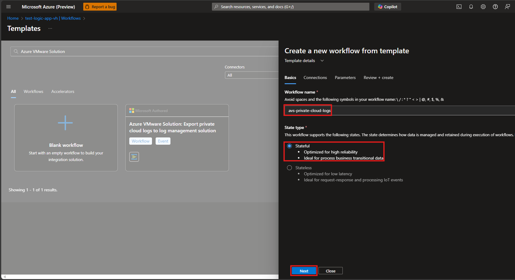 - On the right hand pane, select Use this template at the bottom of the screen. Give the workflow a name and select Stateful for State type.