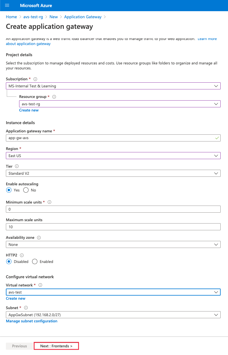 Azure Application Gateway is a layer 7 web traffic load balancer that lets you manage traffic to your web applications, offered in both Azure VMware Solution v1.0 and v2.0. Both versions tested with web apps running on Azure VMware Solution.