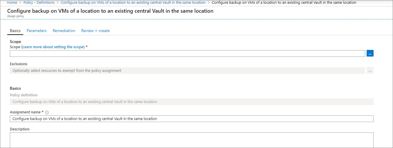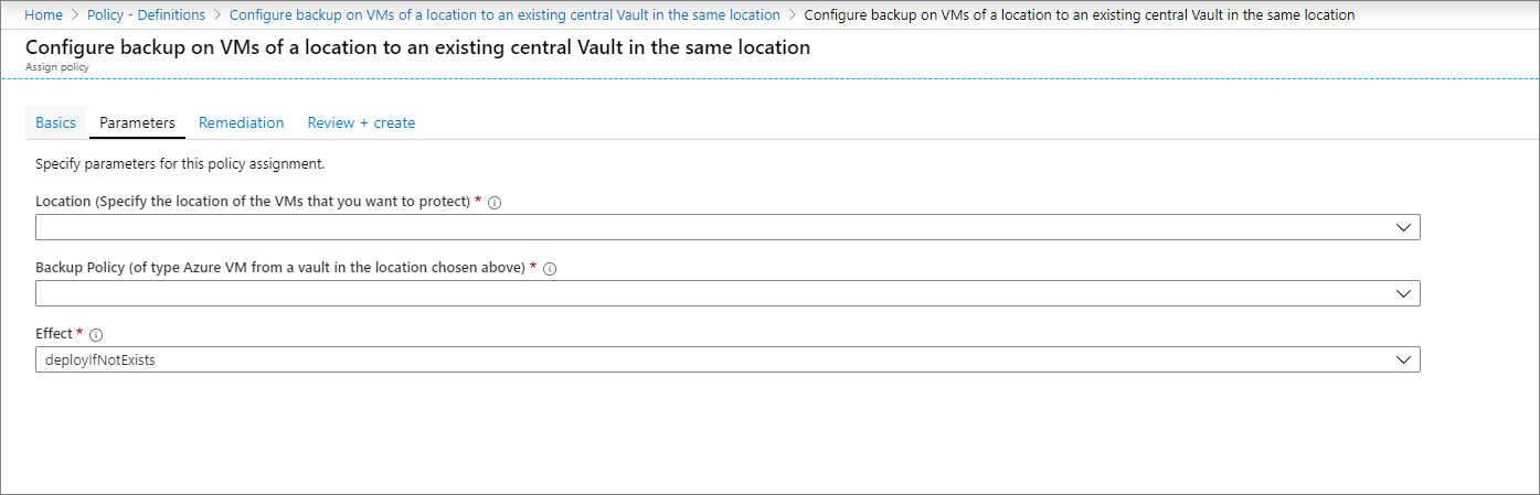 On the Parameters tab, select the Location, Vault, and Backup Policy to which the VMs in the scope must be associated.