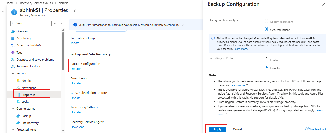 2. On the Recovery Services vaults you selected, go to Settings > Properties.