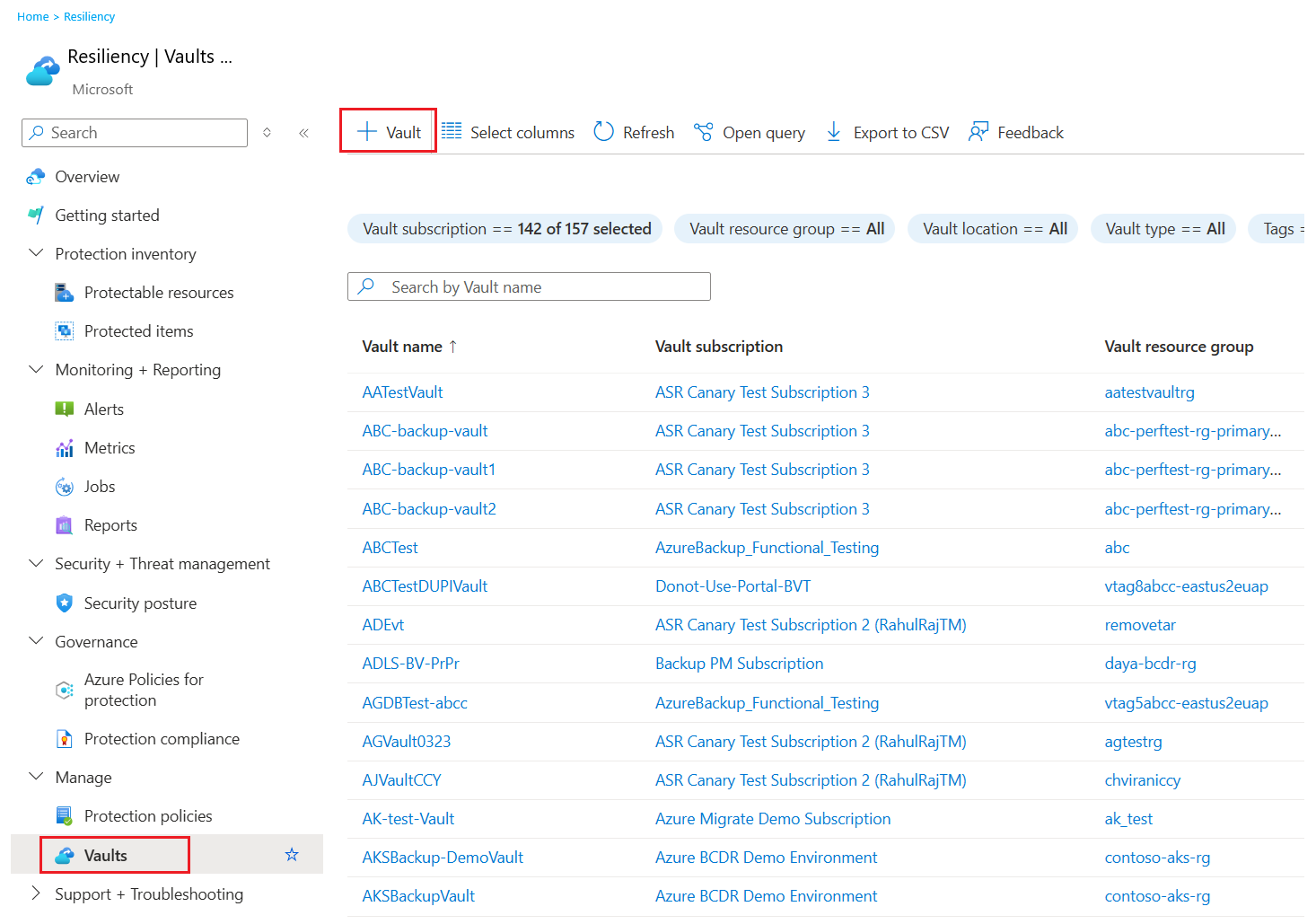 3. On the Vault pane, select + Vault.