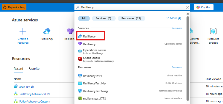 2. Search for Resiliency, and then go to the Resiliency dashboard.