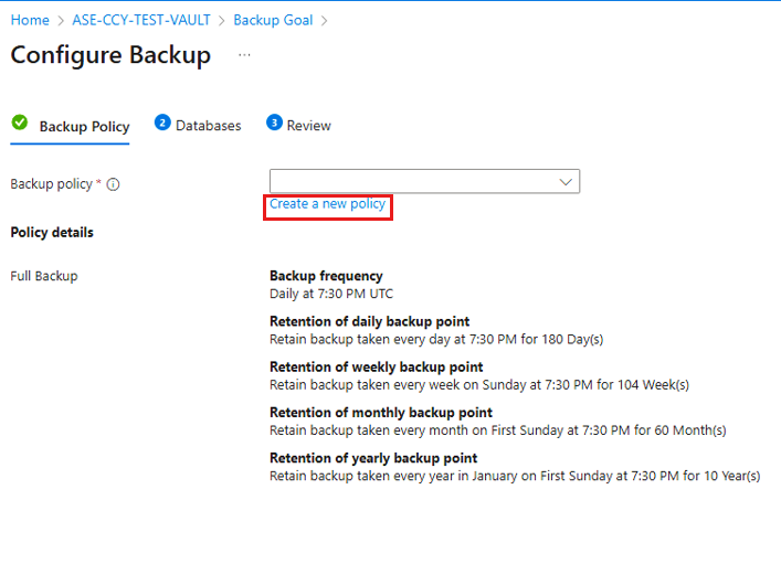 Under Backup Policy, select Create a new policy for the databases.