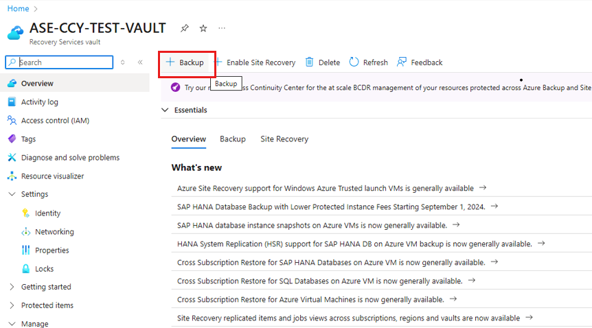 Identify/create a Recovery Services vault in the same region and subscription as the two VMs/nodes of the SAP ASE HA Cluster database.