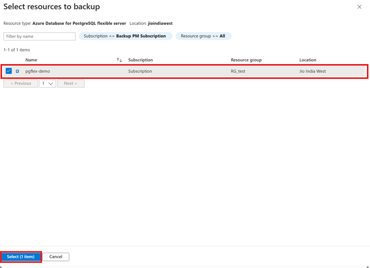 On the Select resources to backup pane, select the Azure PostgreSQL – Flexible Servers to back up, and then click Select.