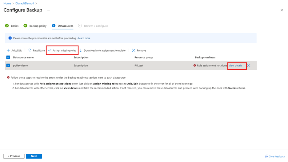 Role assignment not done: This message appears when you (the backup admin) have the write access on the PostgreSQL – flexible Server to assign missing permissions as listed under View details. To grant permissions on the PostgreSQL - flexible Server inline, select Assign missing roles.
