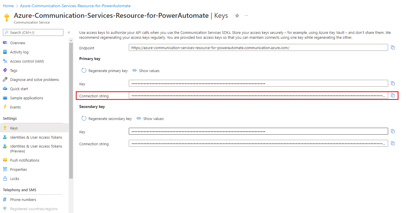 3. Enter the connection string. To get the connection string URL in the Azure portal, go to the Azure Communication Services resource. In the resource menu, select Keys, and then select Connection string. Select the copy icon to copy the connection string.