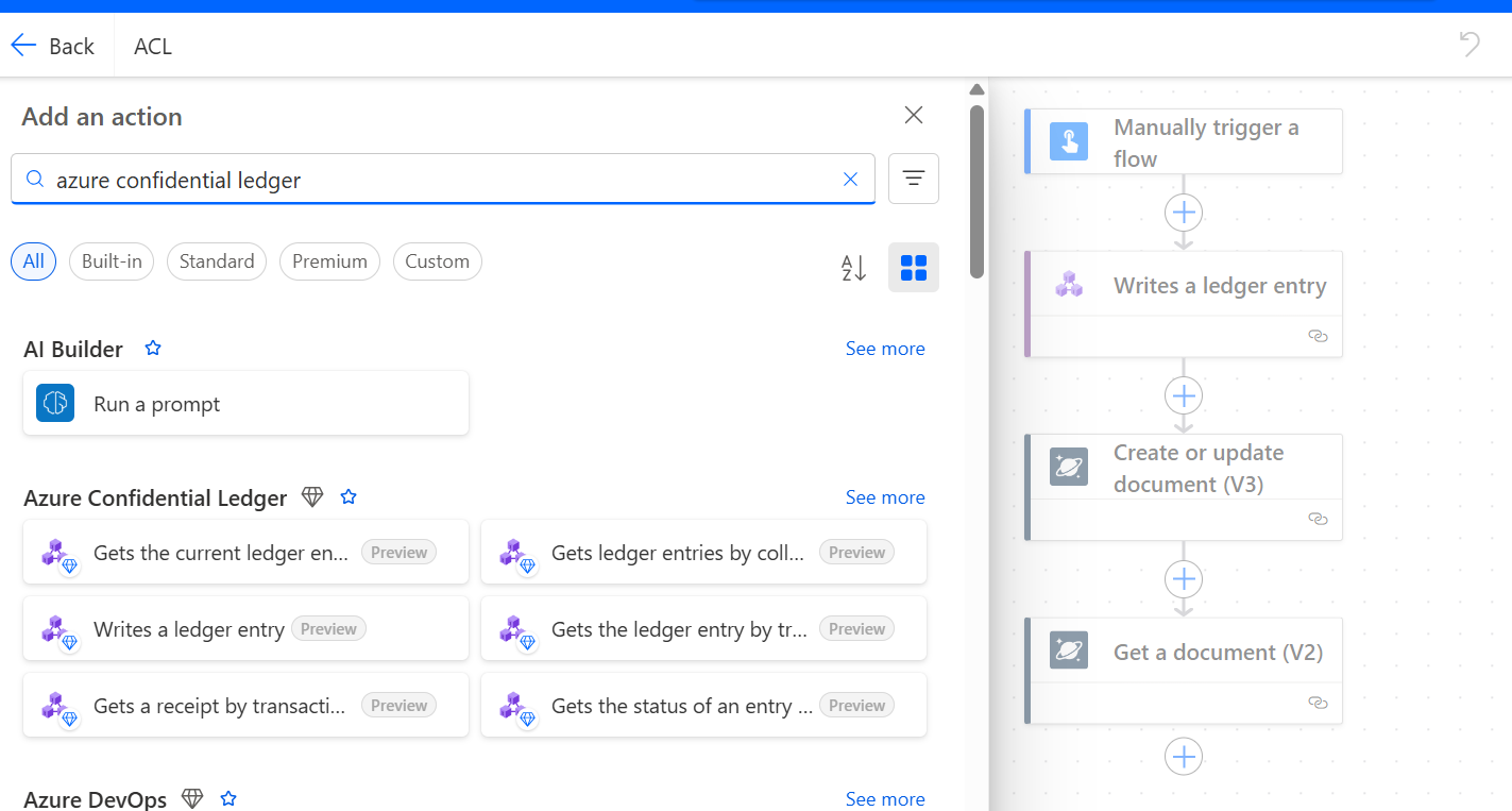 Search for the confidential ledger connector in the Power Automate connectors list. To create a workflow, use the available actions.