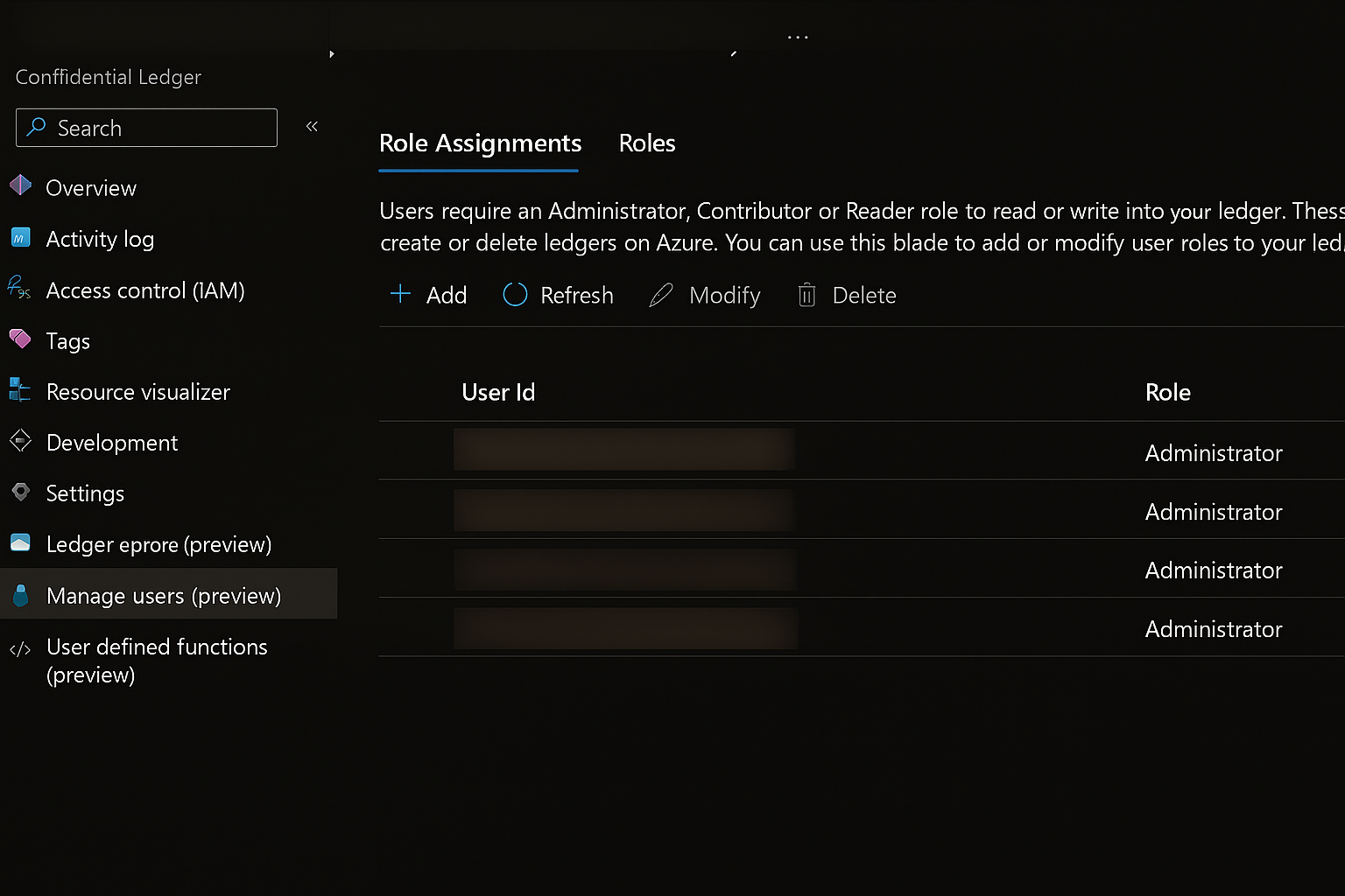 To validate change, go to the Azure portal. Select the confidential ledger instance, and then select Operations > Manage users (preview).