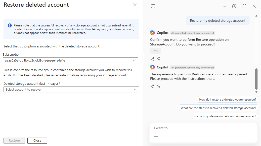 When you say "Restore my deleted storage account", Azure Copilot launches the Restored deleted account experience. From here, you can select the subscription and the storage account that you want to recover.