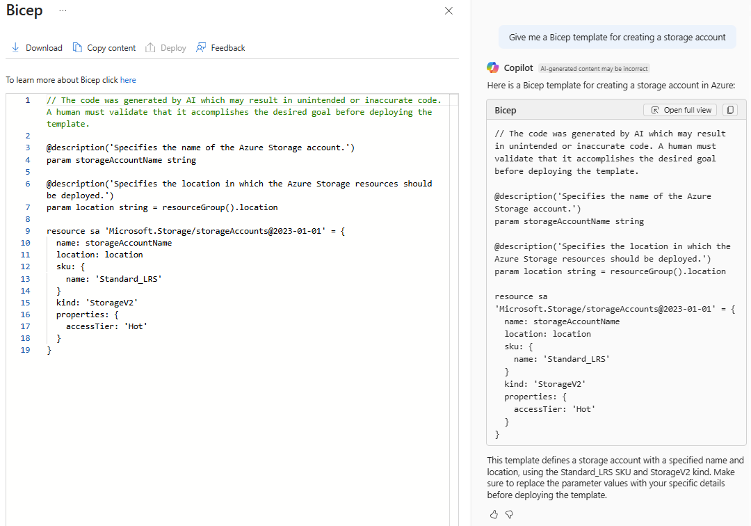 You can also ask Azure Copilot about Azure infrastructure that you'd like to create using Bicep. Copilot provides a template that deploys the necessary resources to create this infrastructure. After generating the initial template, you can ask follow-up questions to further customize the template.