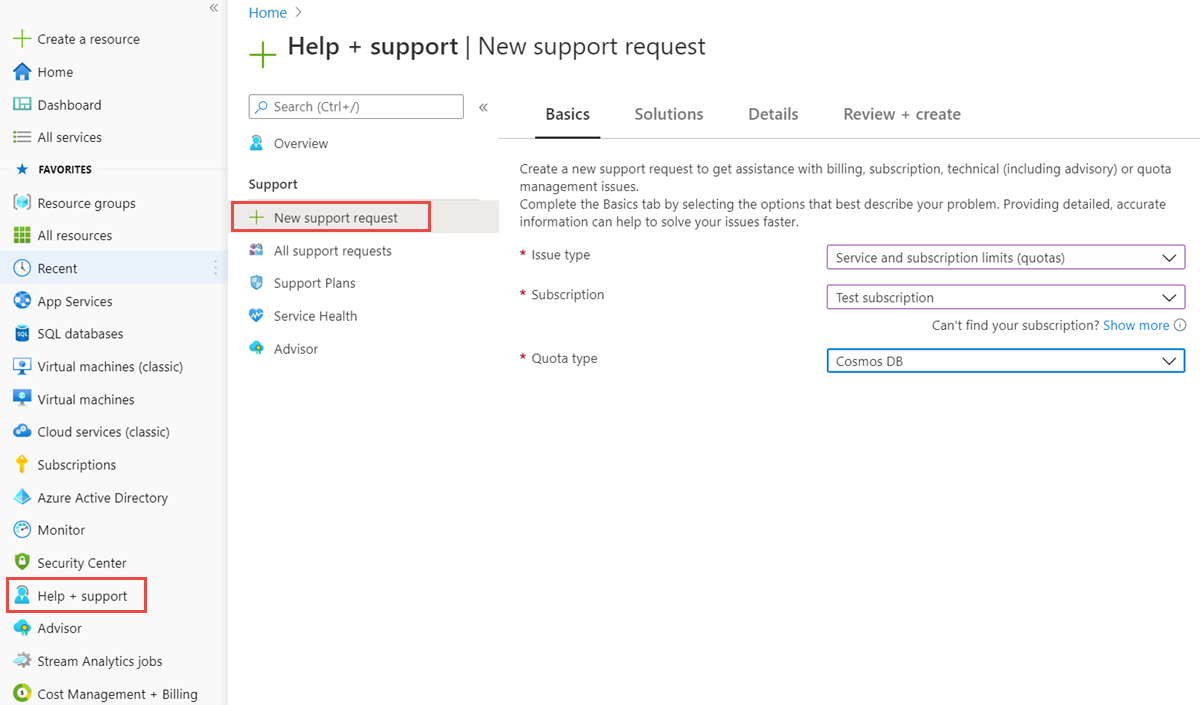 To request a quota increase, you must create a new support request with your workload details. The Azure Cosmos DB team then evaluates your request and approves it. Use the following steps to create a new support request from the Azure portal: